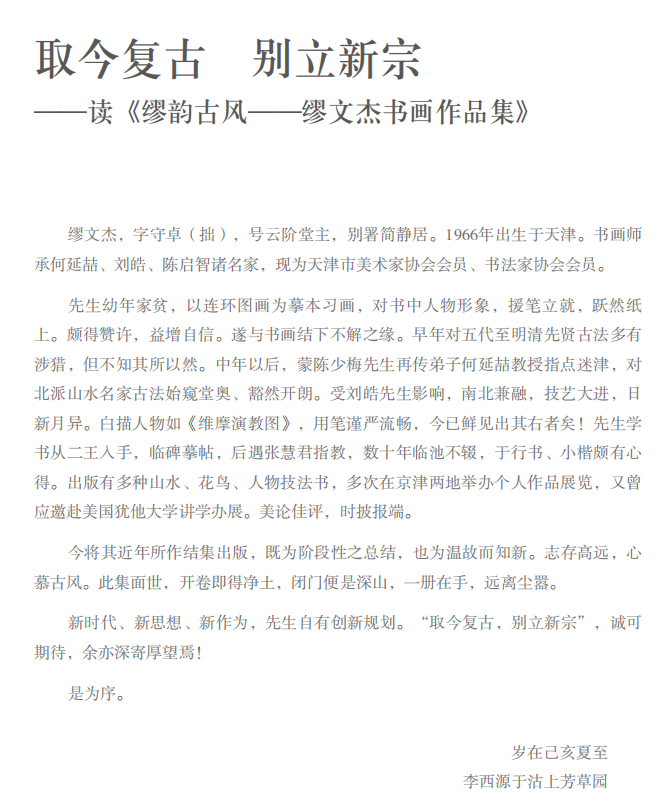 李西源先生为缪文杰作品集《缪韵古风》题序